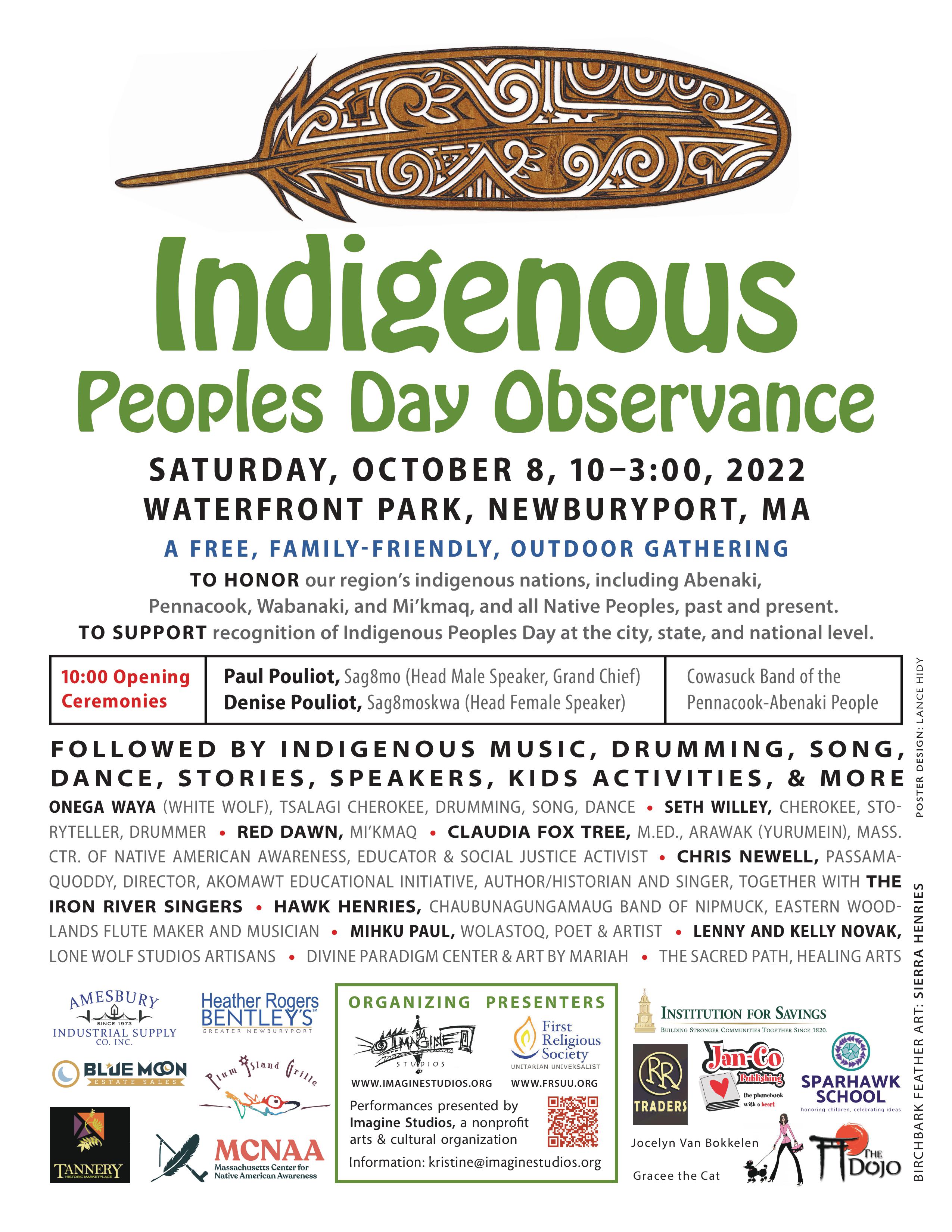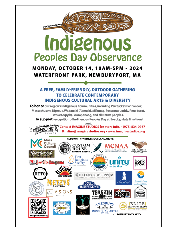 Imagine Studios is pleased to be partnering with Newburyport Diversity, Equity and Inclusion Alliance, city leaders, schools, organizations, businesses and individuals to commemorate Indigenous Peoples Day. We are grateful to our community sponsors and partners (please see poster below). We welcome community participation to support this event, including Indigenous and allied partners, sponsors, volunteers, educators, students, and others to join us! Please email: kristine@imaginestudios.org or call 978-834-0367 to get involved and learn more. Waterfront park is a short walk from all downtown metered lots or garage.