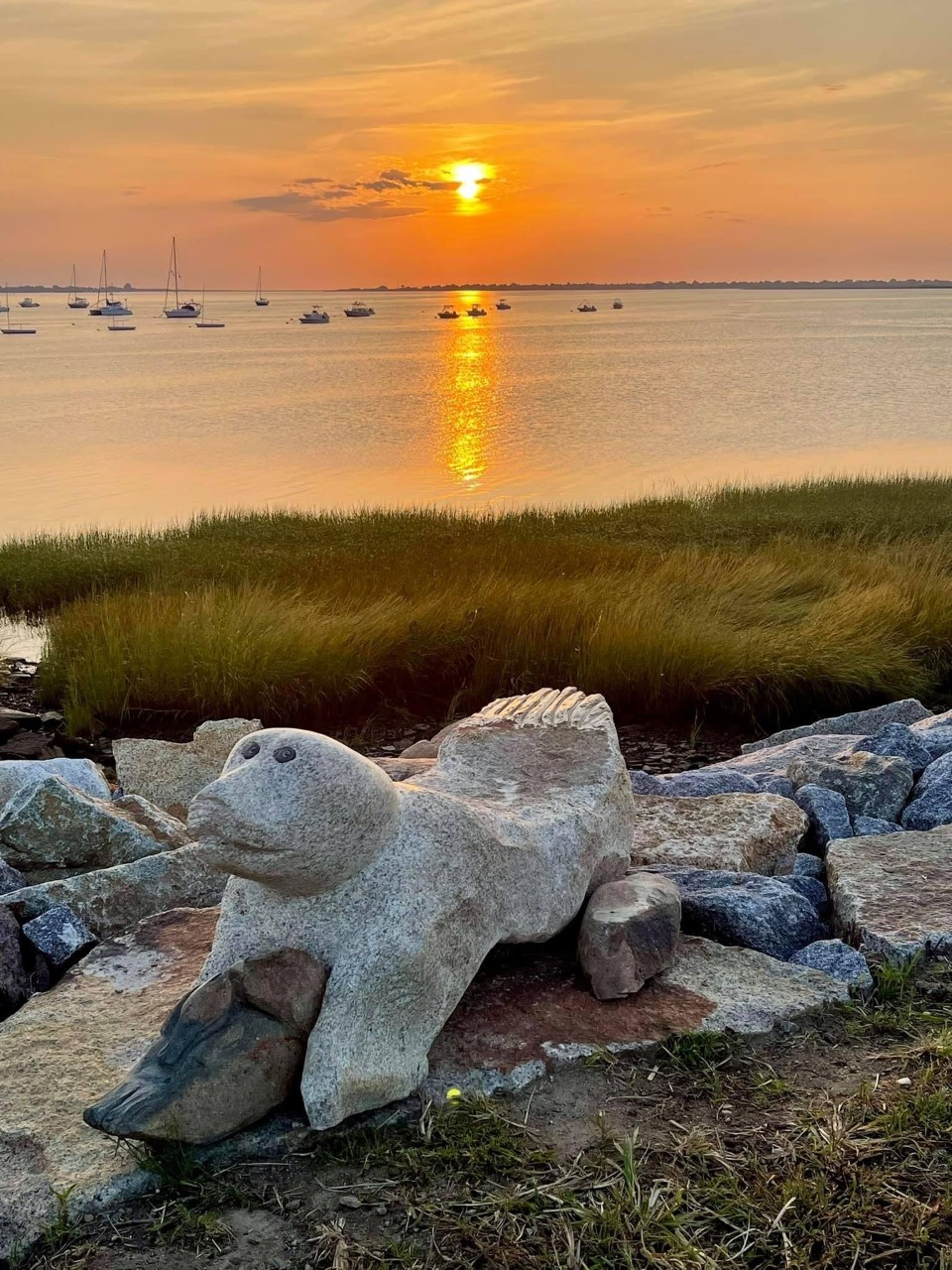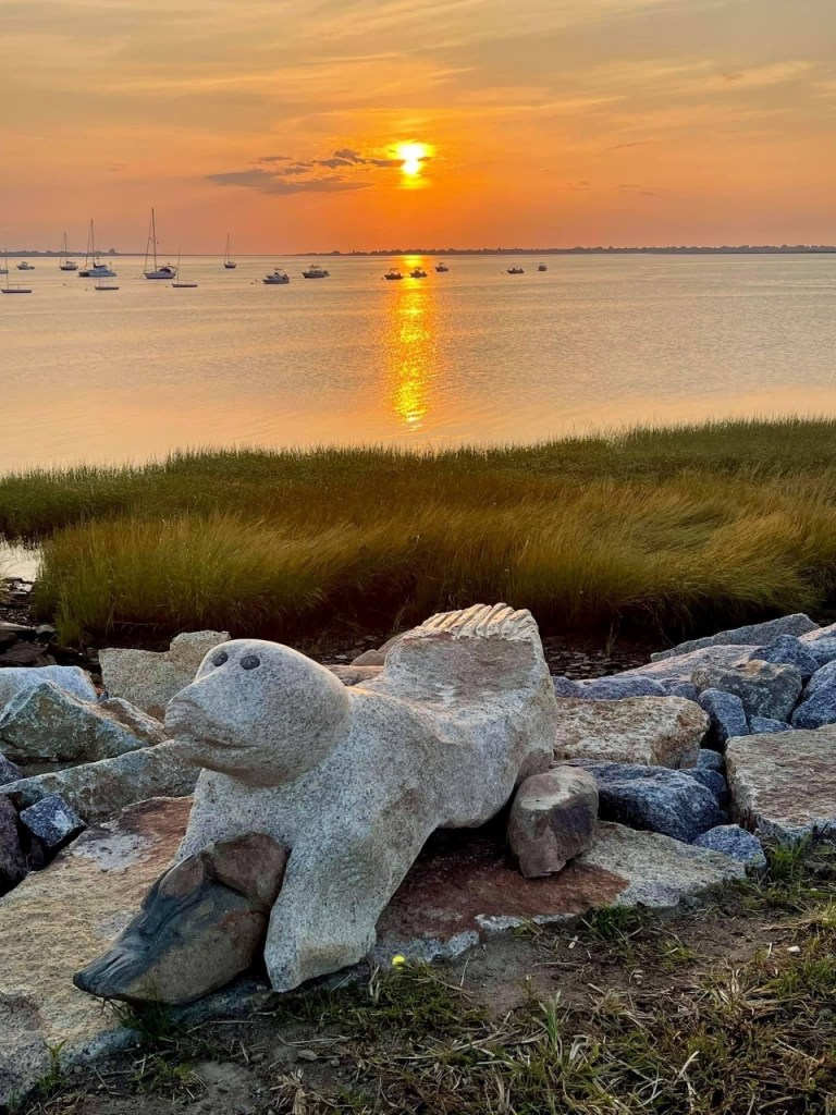 See photos of Gray’s sculpture above, “Harboring Thoughts,” carved for the city of Newburyport, designed to be placed along the Merrimack river, on the clipper city heritage trail. The mother seal and the baby seal represent the Newburyport community, family, and our connection to nature, along the Merrimack. For a complete catalogue.