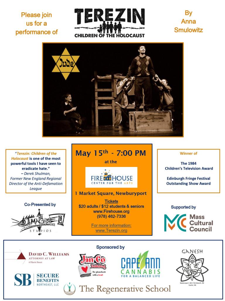 Monday, May 15th at 7:00PM at the Firehouse Center for the Arts in Newburyport, MA. Tickets $20 adults, $12 Seniors & Students: www.firehouse.org, 978-462-7336. More Information: www.terezin.org