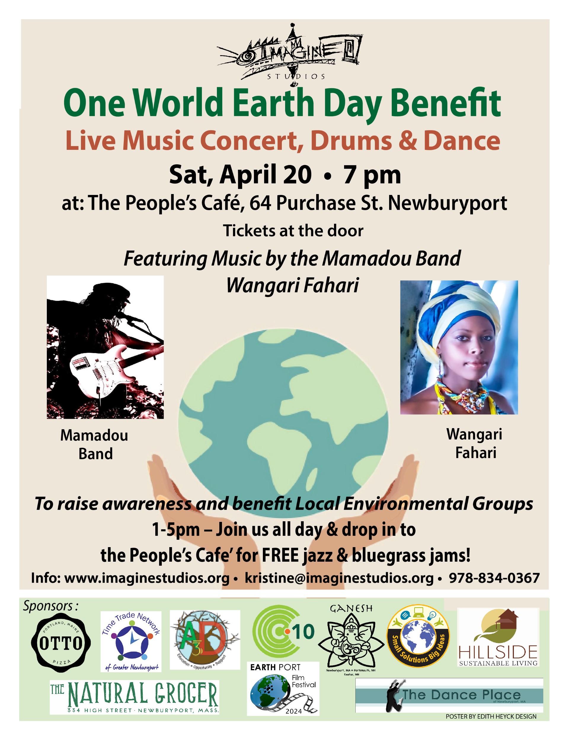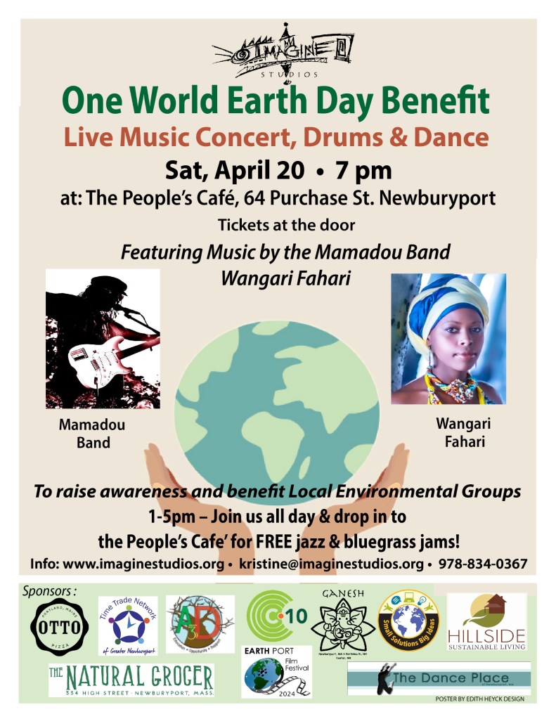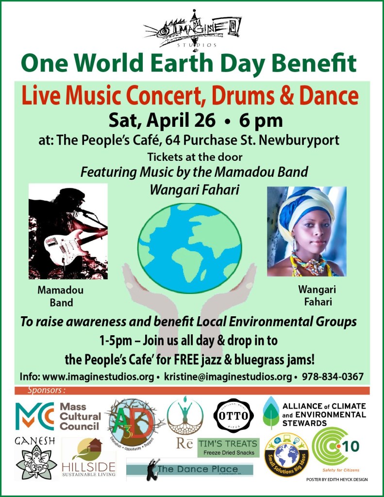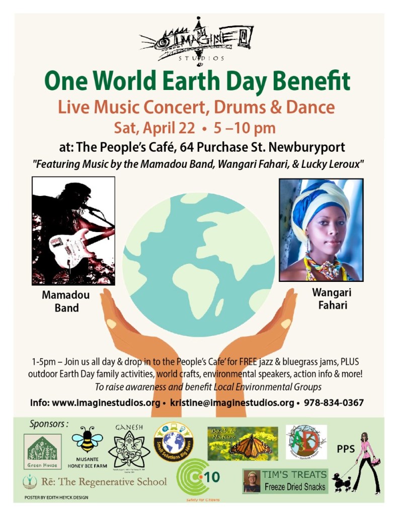Saturday April 26, 6pm: Imagine Studios 4th Annual One World Earth Day Concert, Drum and Dance Party! @ The People’s Cafe’ 64 Purchase St. Newburyport. Mamadou Band: www.mamadou.com & Wangari Fahari: www.faharirecords.com