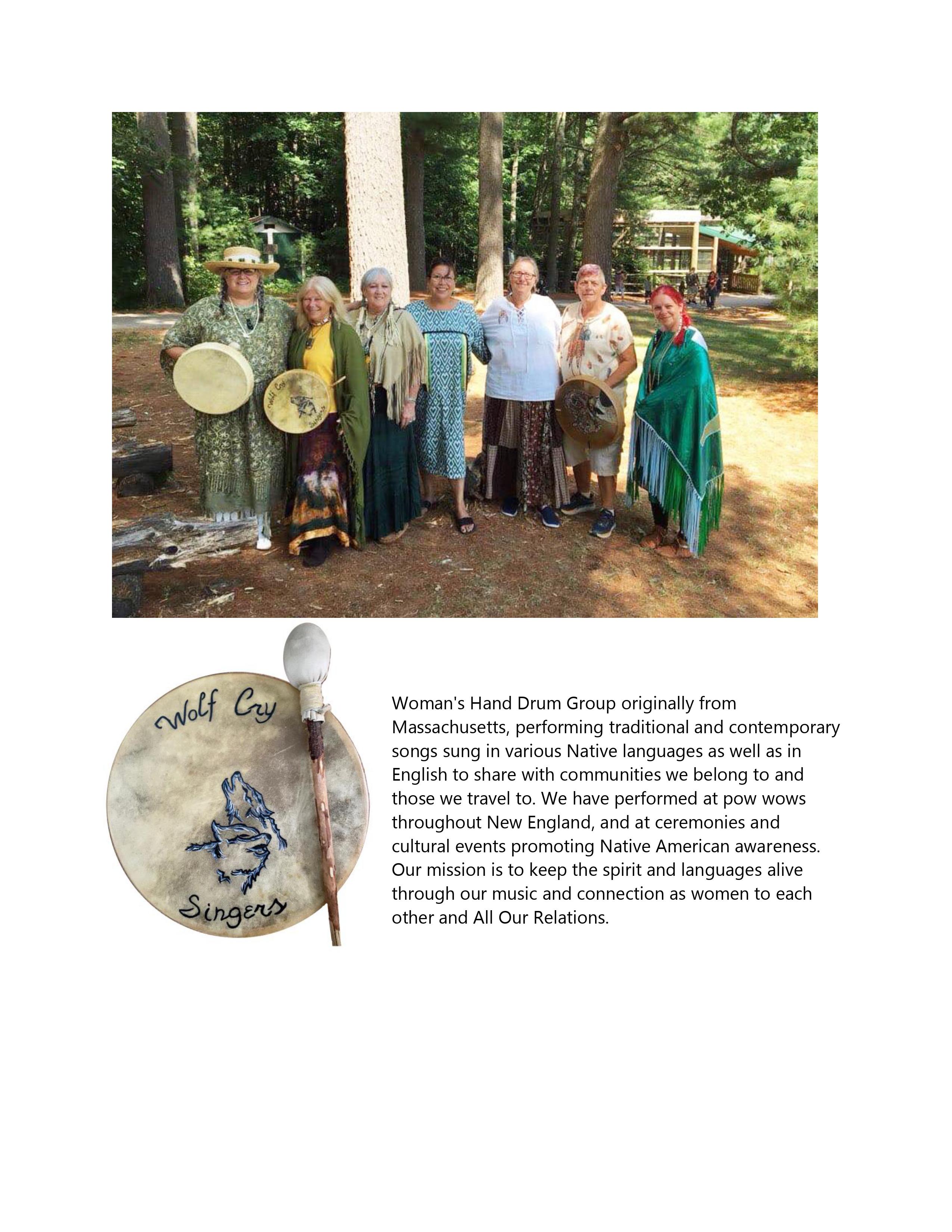 Wolf Cry Singers- Woman’s Hand Drum Group originally from Massachusetts, performing traditional and contemporary songs sung in various Native languages as well as in English to share with communities we belong to and those we travel to. We have performed at pow wows throughout New England, and at ceremonies and