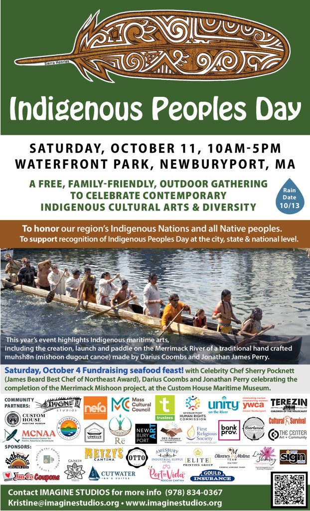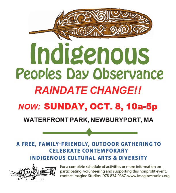Join us for Newburyport’s 4th Annual Indigenous Peoples Day Observance and cultural celebration, Monday October 14th, 10-5, at Newburyport Waterfront Park! For program info see below or FB. Contact: kristine@imaginestudios.org, 978-834-0367