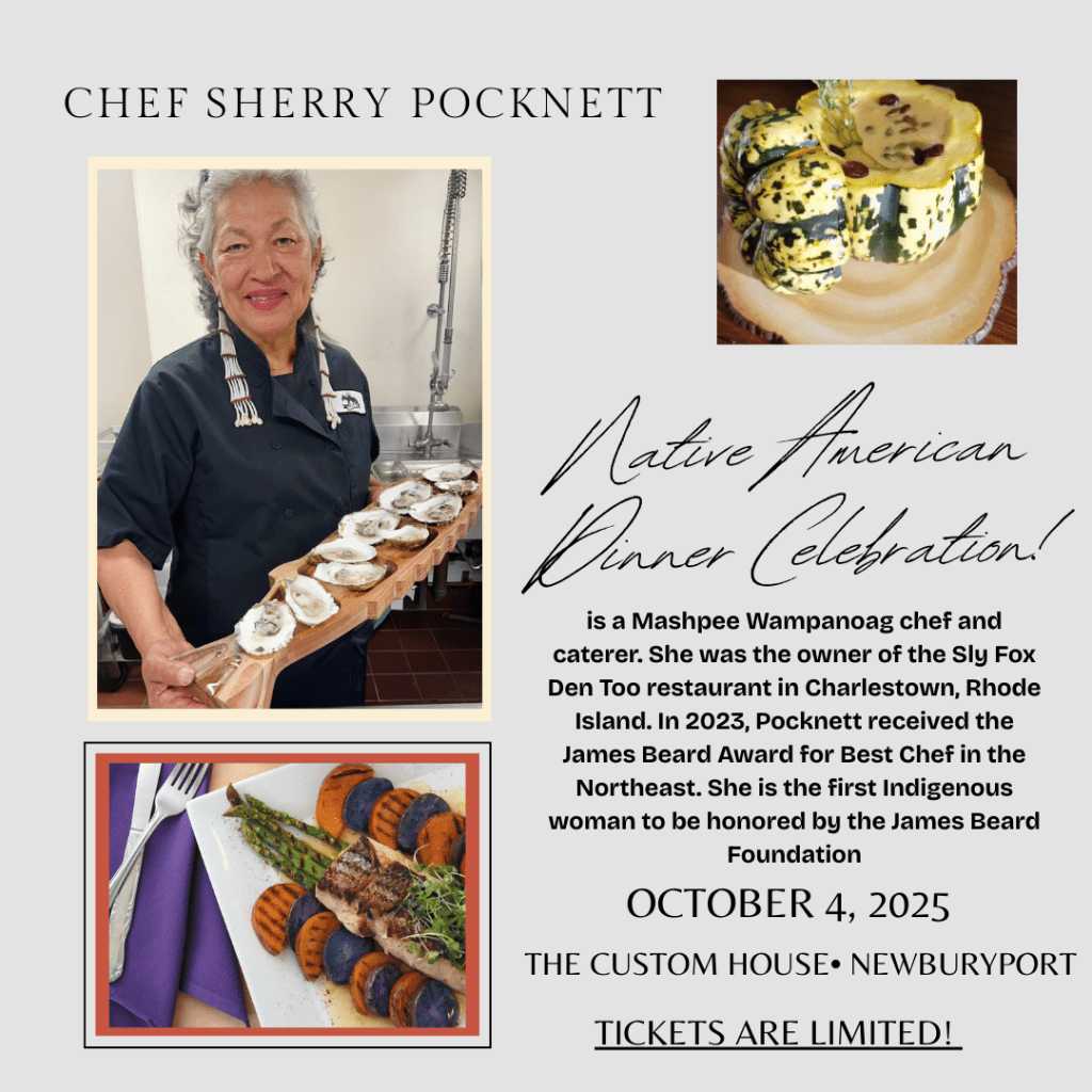 Tickets on sale soon for a fundraising feast with celebrity Wampanoag (James Beard Award WinnER) Chef Sherry Pocknett, Saturday, October 4 @ CHMM !!